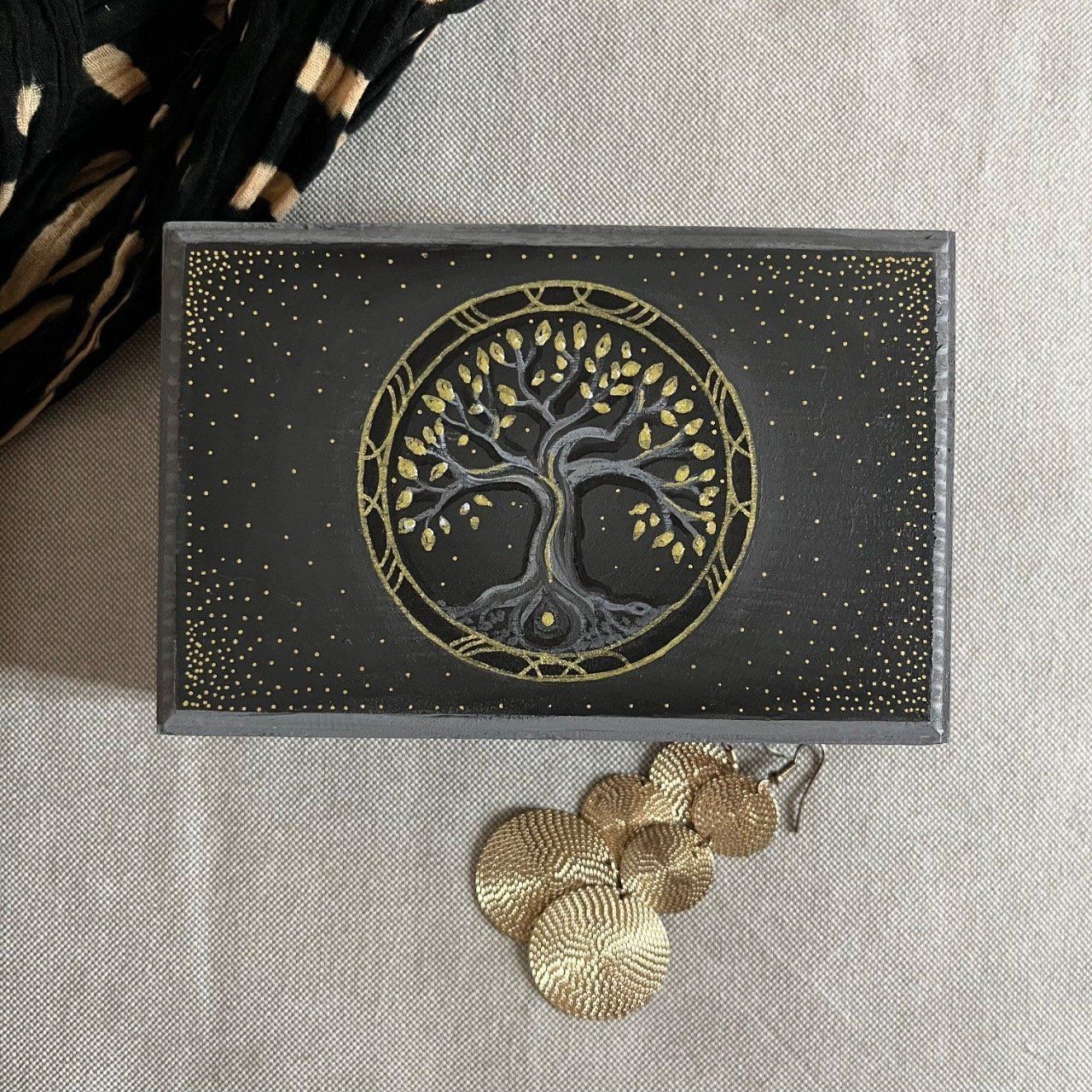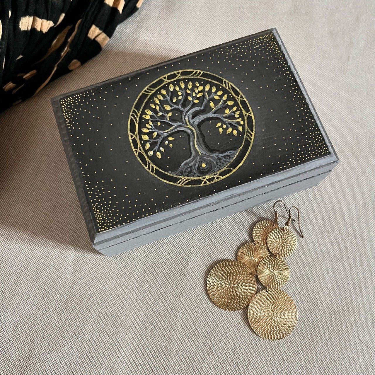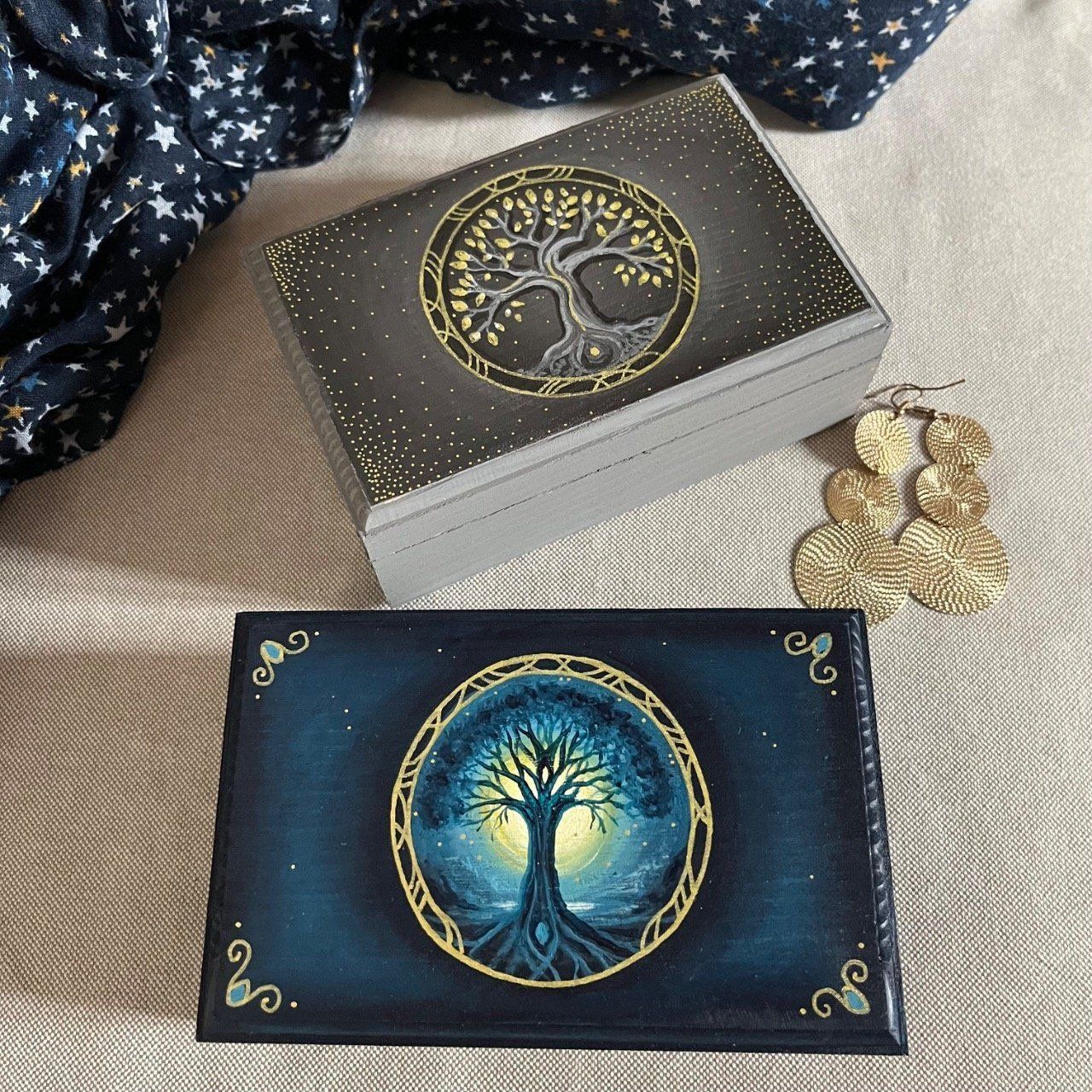 Ajoutez une touche de mystère et de poésie à votre intérieur avec la boîte à bijoux “Céleste”. Conçue pour allier esthétique et praticité, cette boîte en bois noir est sublimée par un arbre majestueux peint à la main. Son feuillage bleu vibrant se détache sur un fond étoilé, évoquant une nuit enchantée où rêves et secrets s’entrelacent.